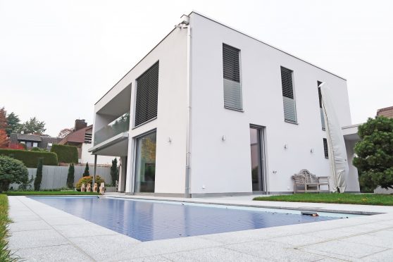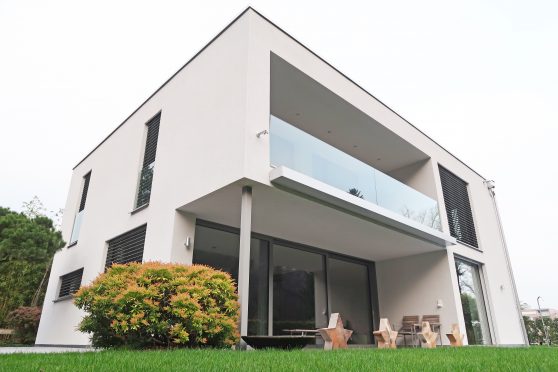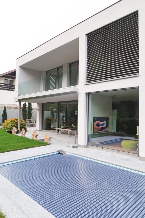 Das Einfamilienhaus befindet sich auf einem Grundstück, von der einen Seite ist sie umgeben von einem Wohngebiet und von der anderen Seite vom Wald. Die Lage und die Nähe zum Wald haben die Ausrichtung des Projektes beeinflusst. Durch ein sauberes und simples Design, welches durch die fliessende Verteilung der Räume hervorsticht, richtet sich das Gebäude zum umliegenden Wald. Die im OG liegende Terrasse und das überdachte Bereich im Erdgeschoss profitieren besonders von dieser Ausrichtung.Der Kunde hatte eine sehr detaillierte Vorstellung, die zu besonderen Elemente geführt hat, wie z.B. eine Minergie-Konstruktion sowie Vollgeschosshöhe Fenster und Türöffnungen. Die marktaktuellsten Tür- und Fenstermodelle mit minimalem Rahmen wurden eingesetzt, um keine Beeinträchtigung in der visuellen Kommunikation zwischen dem Inneren und dem Äußeren des Hauses zu haben.